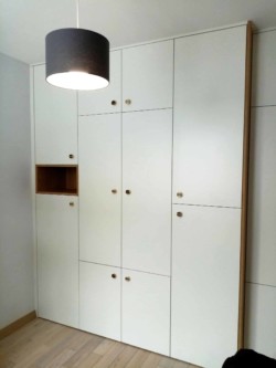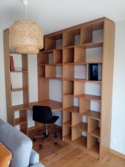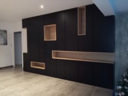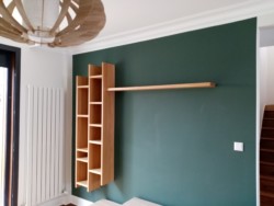 Fabrication d'un agencement sur-mesure dans une salle à manger pour pouvoir obtenir un grand meuble de rangement à la fois esthétique et fonctionnel.