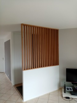 Création d'un claustra bois faisant séparation de pièce et main courante pour l'escalier.